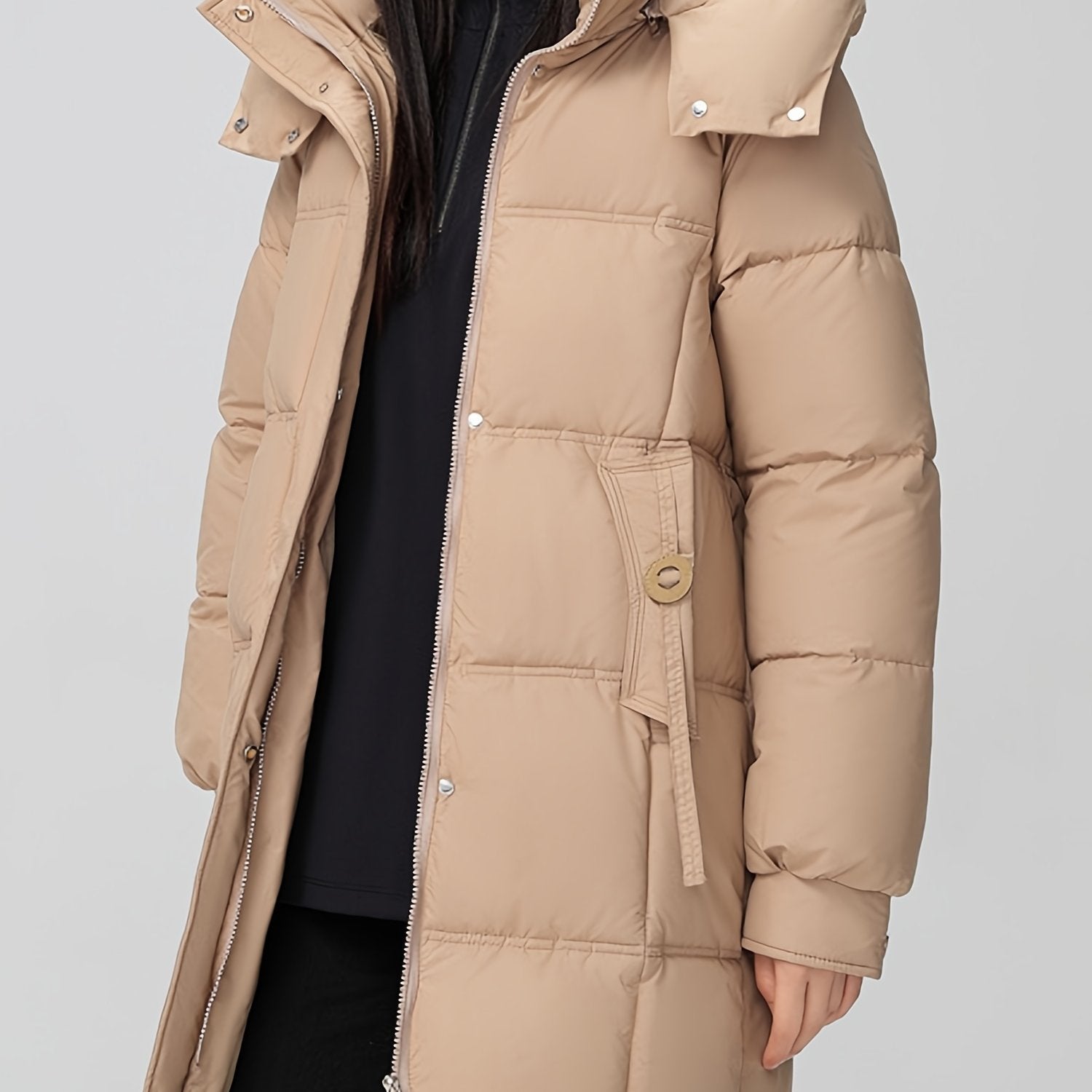 Diese lange Damen Daunenjacke mit abnehmbarer Kapuze bietet zuverlässigen Schutz in der kalten Jahreszeit. Das zeitlose Design sorgt für einen vielseitigen Einsatz im Alltag.